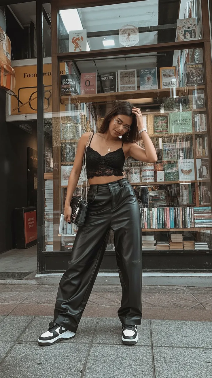 Leather pants are surprisingly versatile for club fashion. They hold their shape beautifully and instantly elevate even the simplest tops. Pairing them with a lace bralette creates contrast, making the outfit feel both bold and classy. Sneakers keep things relaxed, proving that women’s nightclub style doesn’t always need heels to feel confident and modern.