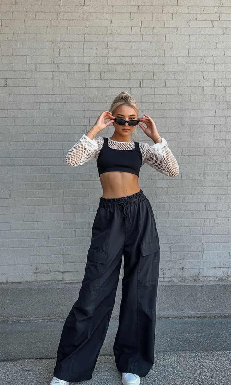 This look captures that energetic nightlife vibe perfectly. The combination of a sporty crop top layered over mesh sleeves instantly gives off that bold, slightly rebellious club energy. Loose cargo pants add movement and comfort, creating an outfit that feels made for dancing all night. There’s something playful yet powerful about this style, like stepping into a packed Techno club where the music pulses through the floor.