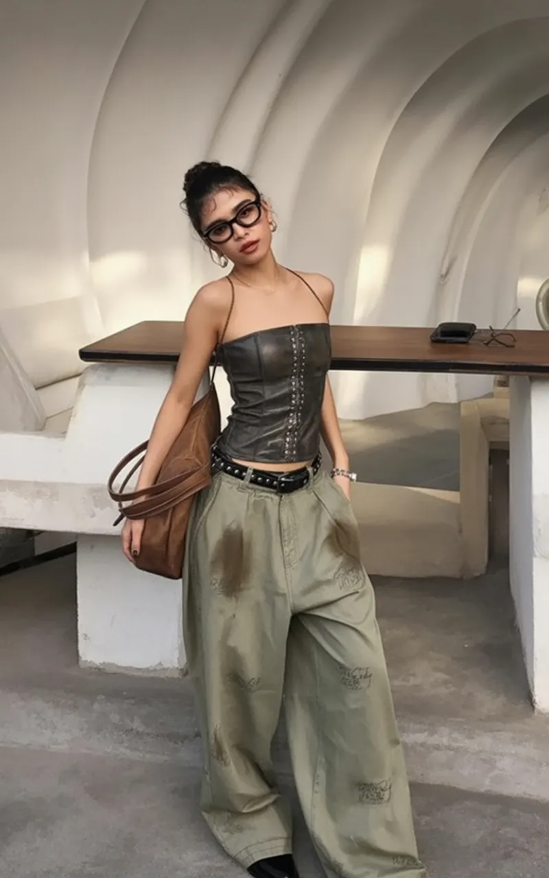 This look feels like a bold fusion of edgy and artistic. The leather corset top adds a slightly Goth-inspired vibe, while oversized cargo pants soften the look with relaxed street energy. The result feels rebellious in the best possible way—like someone who moves easily between underground galleries, late-night cafés, and an alternative women’s nightclub playing deep Techno sets.