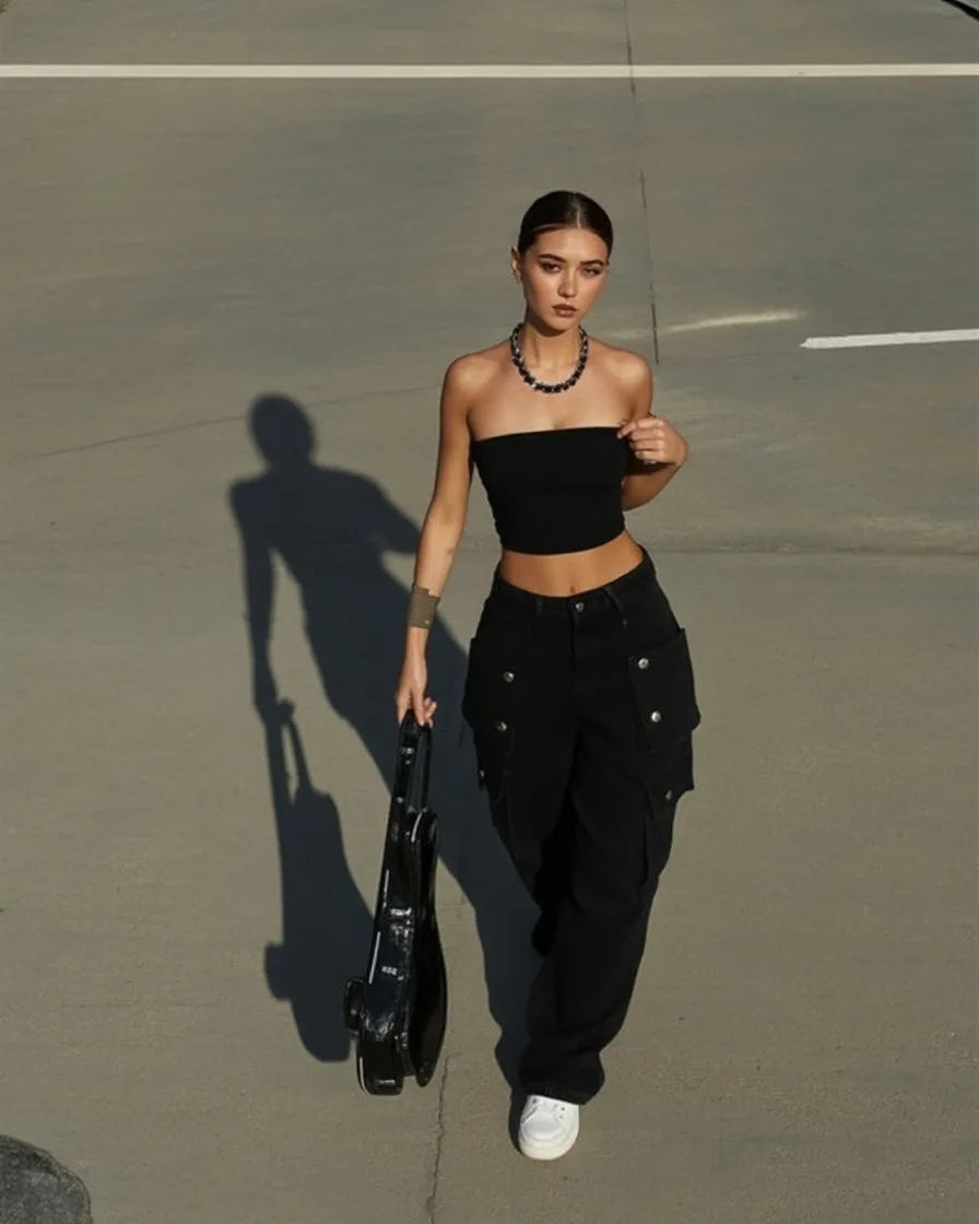 This outfit has that confident “main character” energy the moment you see it. The strapless black top feels sleek and feminine, while the structured cargo pants add a slightly edgy, street-inspired twist. Walking under warm evening light, the look almost feels cinematic—like a scene straight out of a late summer night where the music is loud, the city is glowing, and the women’s nightclub scene is buzzing.