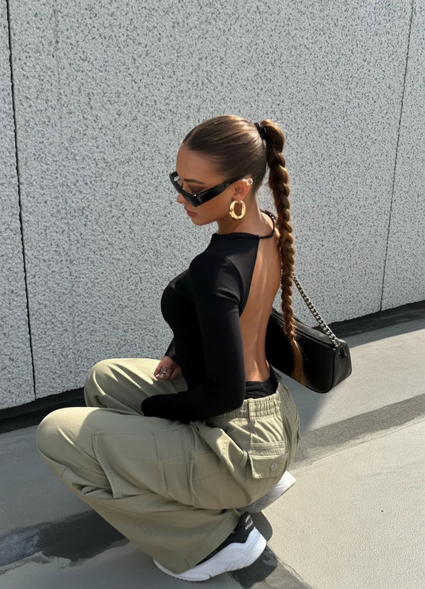 There’s something instantly captivating about a long, sleek braid paired with a dramatic open-back top. This outfit feels powerful yet elegant, almost like a quiet fashion statement that doesn’t need bright colors to stand out. The combination of neutral cargo pants and a fitted black top creates a confident silhouette that feels perfectly suited for a modern woman’s nightclub or a stylish rooftop party.