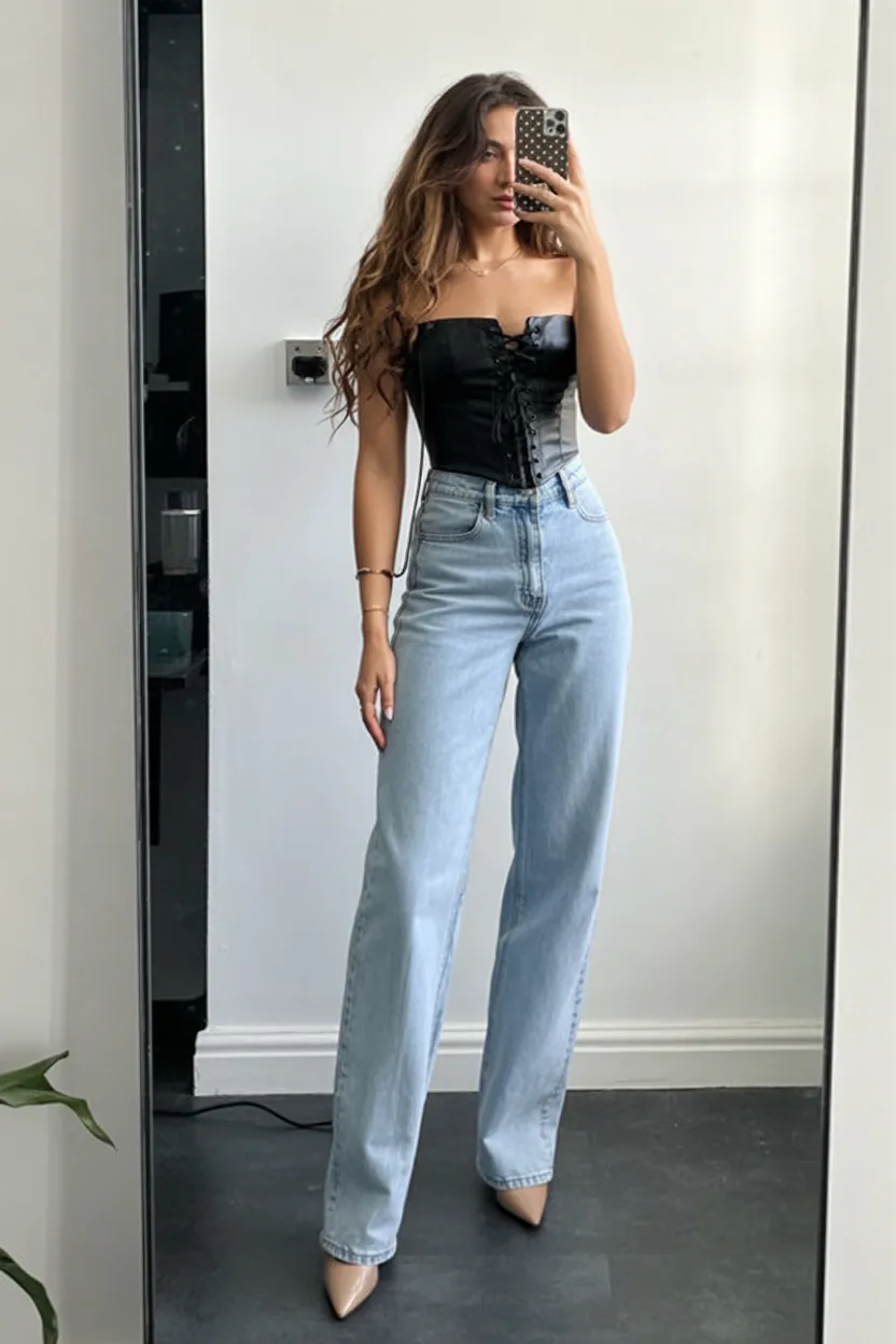 This look is especially flattering for women who love highlighting their waist while keeping the rest of the outfit relaxed. The corset shapes the silhouette beautifully, while straight-leg denim keeps the vibe approachable and comfortable. Pair it with pointed heels and minimal jewelry for a classy finish that works perfectly for late evenings in the city.