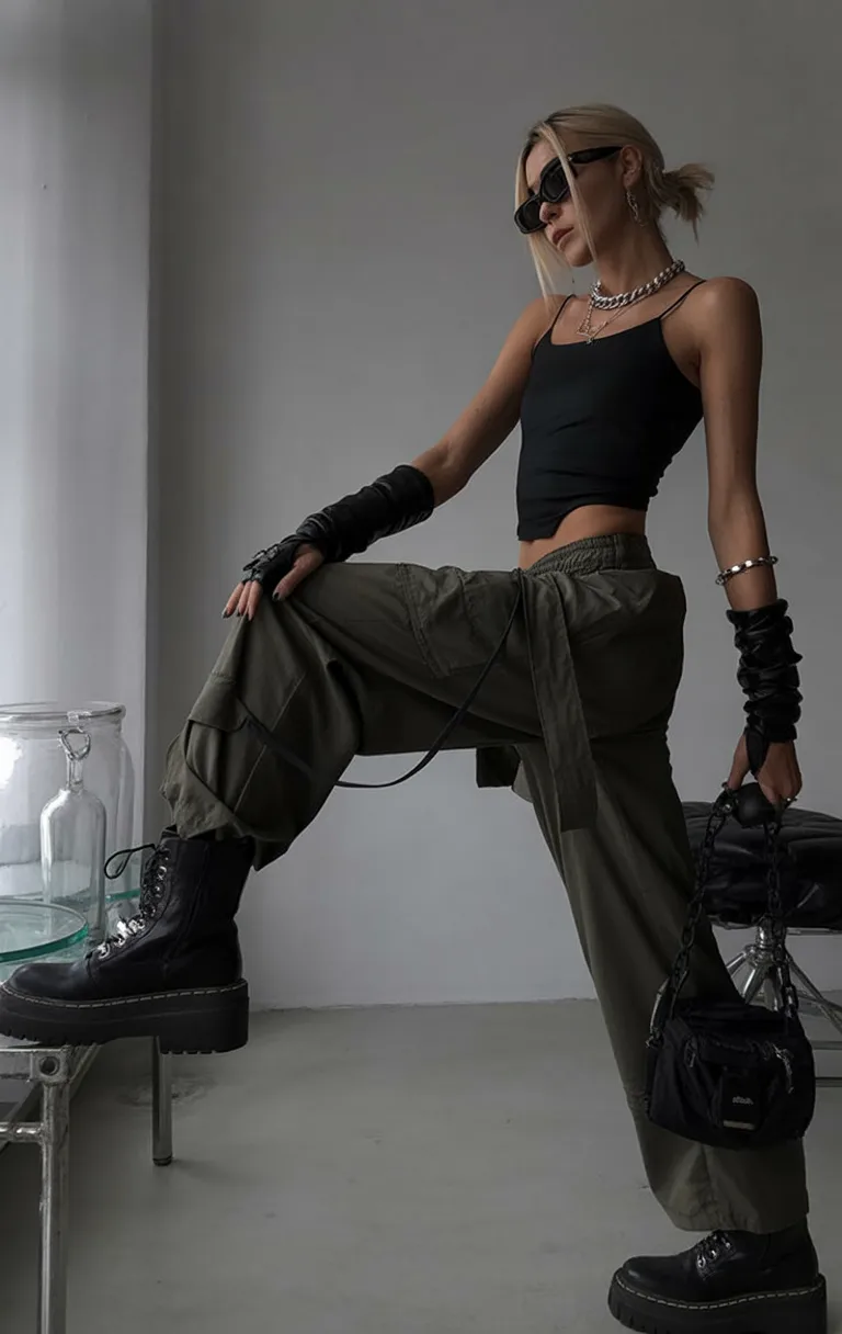 This outfit feels like pure alternative nightlife energy. Oversized cargo pants paired with a fitted black crop top create that slightly rebellious street aesthetic that’s been growing in popularity again since the Y2K revival. Chunky boots and layered accessories make the look even more dramatic, giving it a vibe that fits perfectly in underground clubs or edgy city nightlife.