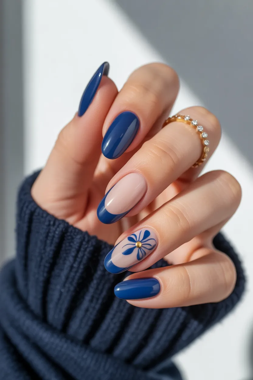 One of the reasons this design feels so wearable is its simplicity. Most nails remain a clean glossy navy, allowing the floral art to stand out without overwhelming the look. This balance makes the manicure surprisingly versatile. Whether you’re wearing cozy sweaters in winter or light fabrics in summer, these flowers paired with navy polish create a design that always feels elegant and thoughtfully styled.