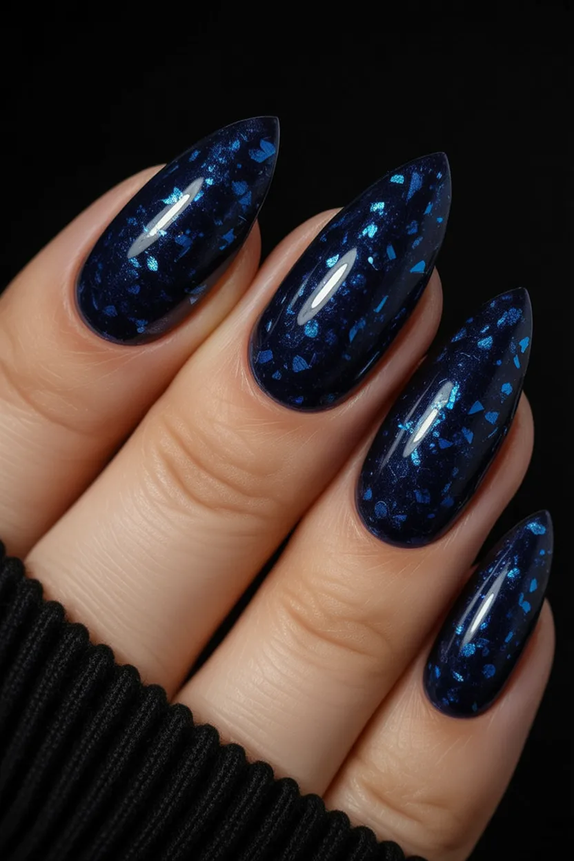 This look works beautifully if you enjoy statement nails that still feel polished rather than over-the-top. The almond shape elongates the fingers, while the glitter adds dimension and shine. Compared with matte or flat navy polish, the sparkly finish gives the manicure more depth and personality. It’s a perfect option for anyone who loves glamorous design ideas with a sophisticated edge.