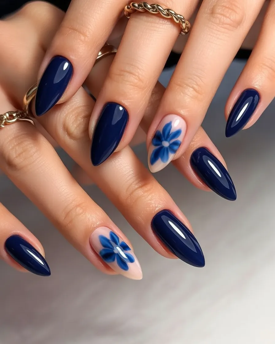What makes this style especially appealing is how balanced it feels. Most nails remain sleek and glossy, allowing the floral art to stand out without overwhelming the manicure. This approach keeps the look refined while still adding personality. Almond-shaped nails showcase the design beautifully, making this manicure a lovely option for anyone who enjoys subtle art combined with classic navy polish.