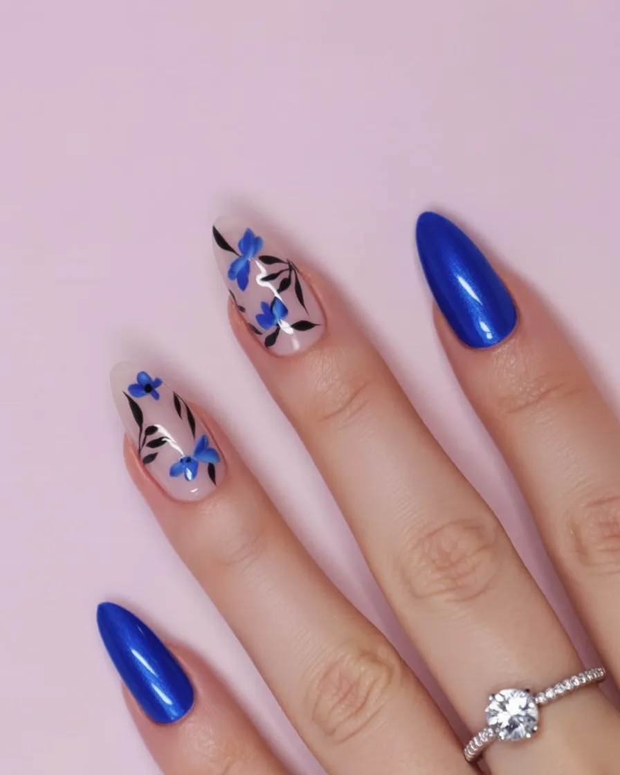 Bright cobalt blue paired with delicate floral accents creates a manicure that instantly feels lively and expressive. The bold glossy polish gives the nails a confident, energetic vibe, while the soft nude accent nails decorated with tiny flowers soften the overall look. It’s a lovely combination of strong color and graceful art—playful without feeling childish, elegant without being too serious.