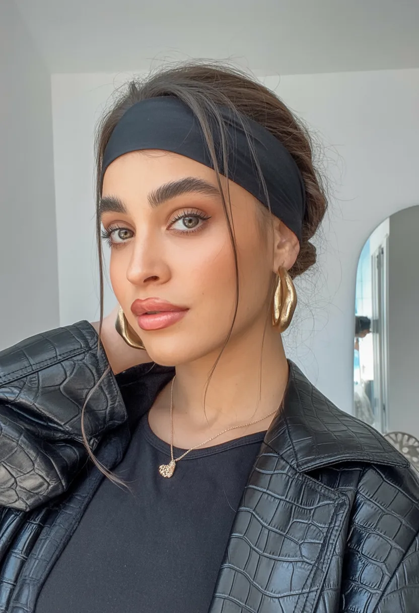 This hairstyle is especially practical for busy days when you want your hair up and out of the way. Gather the hair into a low bun or twist and secure it with an elastic, then slide on a stretchy fabric headband to hold the front neatly in place. The result is a comfortable, low-maintenance style that still looks polished and fashion-forward.