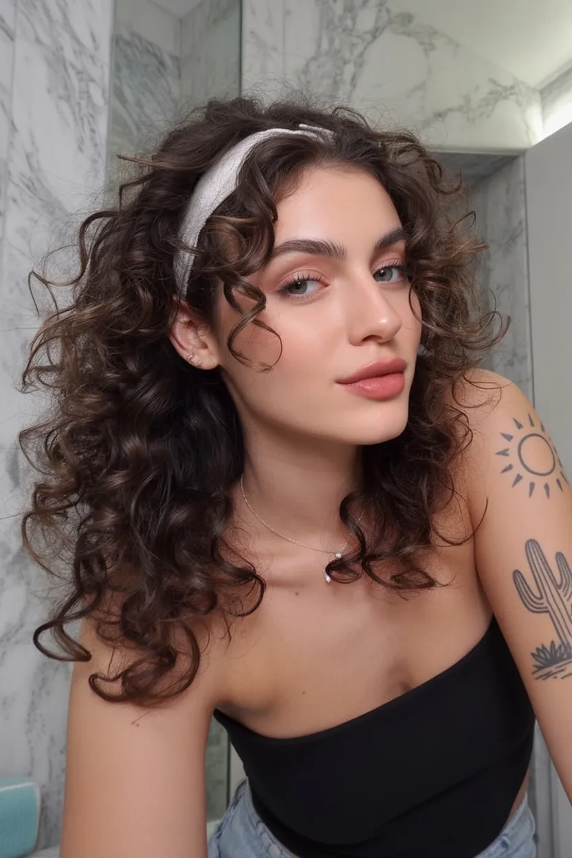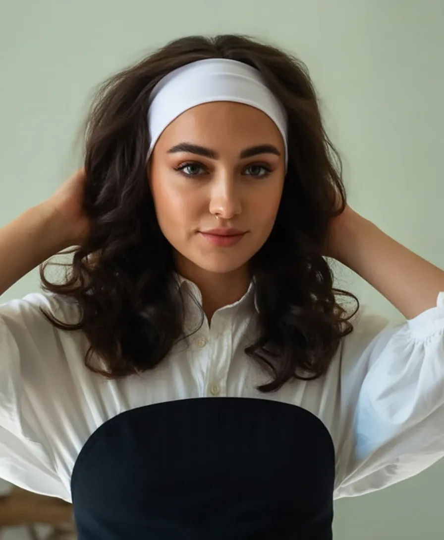 This hairstyle is perfect for women with naturally wavy or curly hair who want to keep their texture but add structure around the hairline. The fabric headband helps control volume at the crown while letting the rest of the hair move freely. It’s a simple way to elevate everyday hair without adding complicated styling steps.