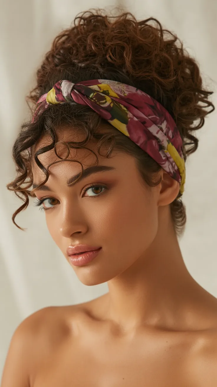 This style works beautifully for naturally curly hair or short curly hair that needs a bit of lift and structure. Simply gather the hair into a relaxed updo, leaving a few curls loose around the face, then wrap a soft fabric scarf as a headband to secure everything. The scarf adds color and texture while keeping the style comfortable and wearable throughout the day, making it especially lovely for women who want a relaxed yet stylish look.