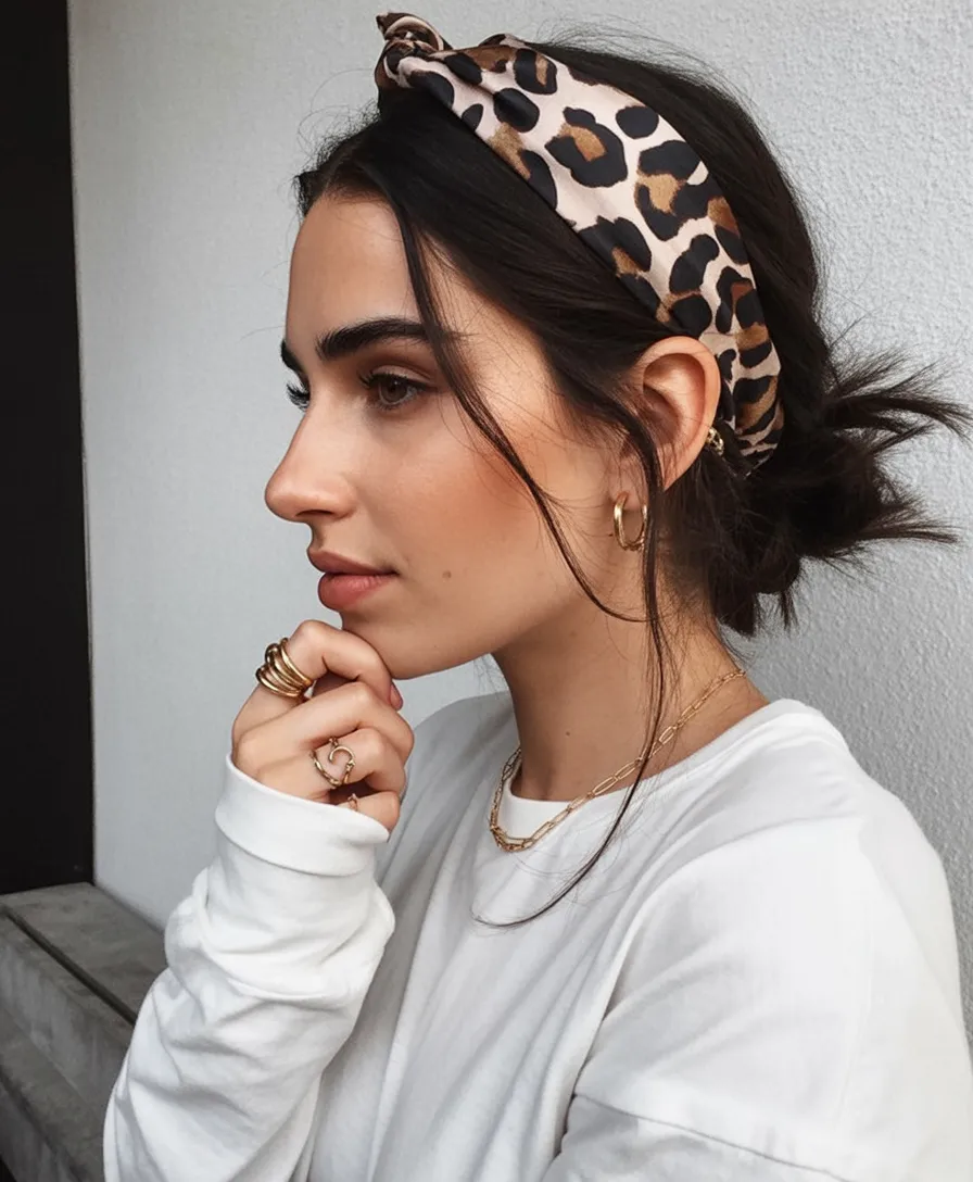 A sleek low bun paired with a patterned cloth headband has a certain quiet confidence about it. The smooth hair gathered neatly at the nape keeps everything elegant and composed, while the leopard headband introduces just enough personality to make the style interesting. It feels modern but with a little vintage flair—the kind of look that works just as well for coffee with friends as it does for a casual dinner out.