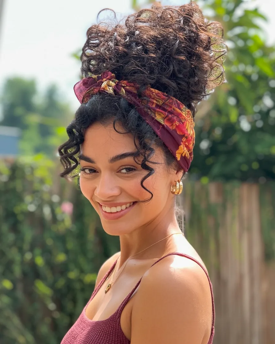 This style is especially lovely for natural hair or naturally curly textures that already have volume and movement. Gather the curls into a high bun and secure them loosely so the texture remains soft and airy. Then wrap a colorful scarf around the base as a headband to keep everything in place. It’s a fantastic option for warm days or casual outings when you want something comfortable but still eye-catching.