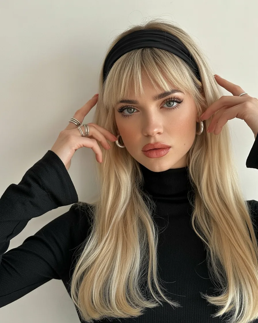 Long, straight hair with soft bangs paired with a wide black headband has that polished, slightly retro elegance that always feels stylish. The smooth strands fall neatly over the shoulders, while the headband adds structure at the crown, creating a clean silhouette that highlights the eyes and cheekbones.