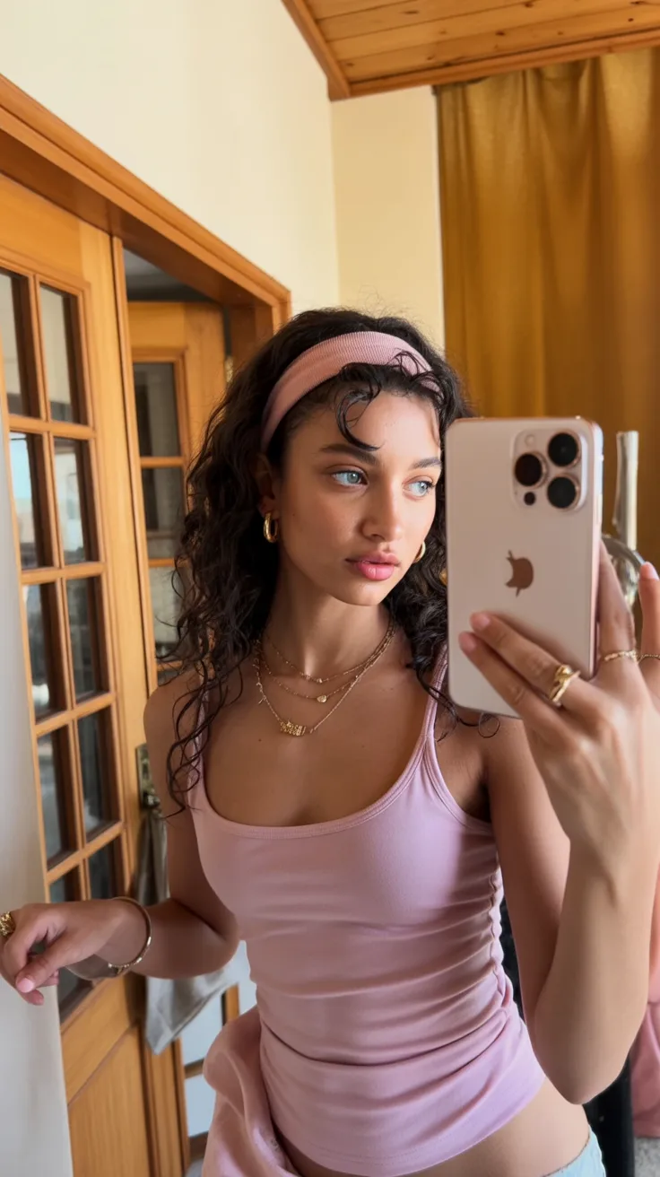 There’s something irresistibly relaxed about soft curls paired with a gentle pink headband. The loose strands framing the face give the hairstyle a natural, almost effortless beauty—like one of those mornings when your hair simply decides to cooperate. The soft color of the stretchy headband adds a playful touch while letting the curly hair remain the true star of the look.