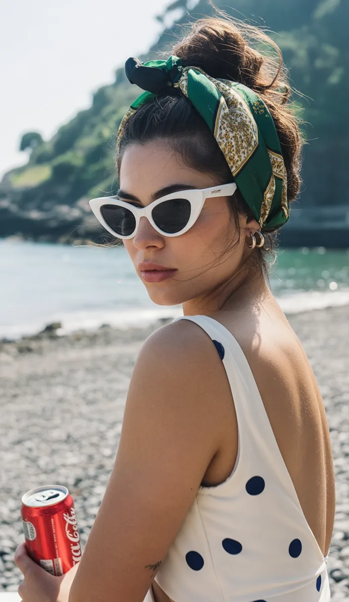 A voluminous bun wrapped with a colorful scarf always carries a little vacation energy with it. The updo hairstyle lifts everything away from the neck, creating a light and breezy look that feels perfect for sunny days. Paired with oversized sunglasses and a relaxed outfit, this style brings a charming boho spirit that feels carefree and stylish all at once.