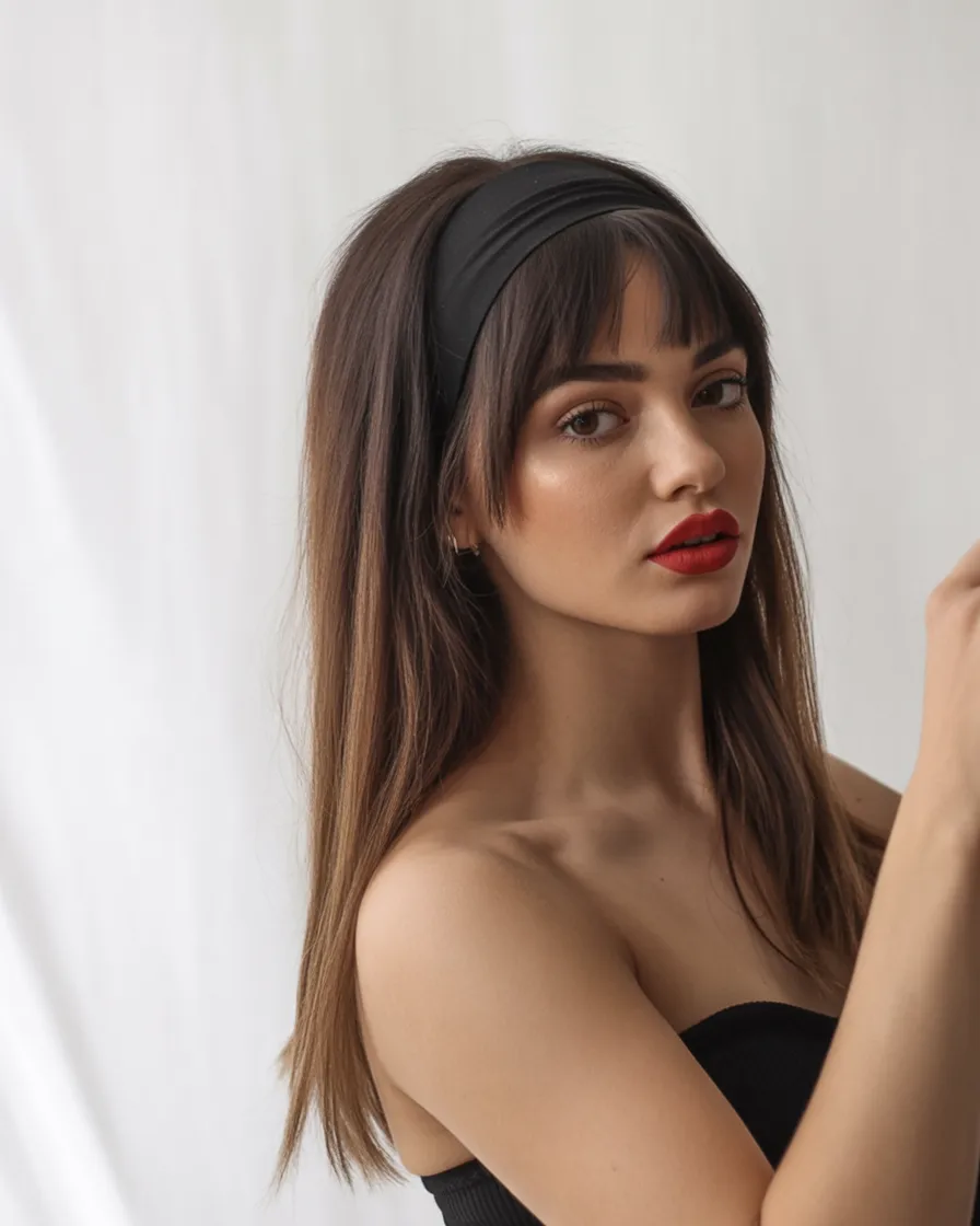 This hairstyle works particularly well for women with straight hair who enjoy classic looks with a modern twist. The wide headband keeps the hairline tidy while allowing the bangs to frame the face naturally. It’s a flattering option for everyday wear, giving the impression of a carefully styled look without requiring much effort.