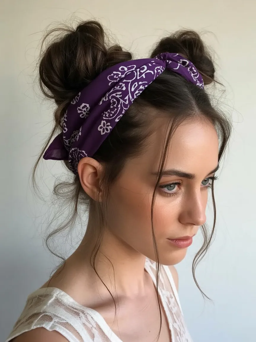This style works beautifully for medium to long hair and is surprisingly easy to recreate. Divide the hair into two sections, twist them into buns, and secure them with elastic ties. Then wrap a cloth bandana around the crown as a headband. The result is a cute updo that feels modern, playful, and full of character.