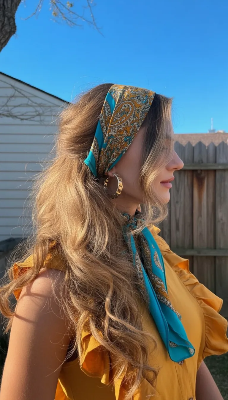 This look is ideal for long hair with natural waves or softly styled curls. The scarf works as both a headband and a statement accessory, keeping the front pieces neat while still allowing movement throughout the length. It pairs beautifully with light fabrics and relaxed outfits, creating a hairstyle that feels effortless yet thoughtfully styled.