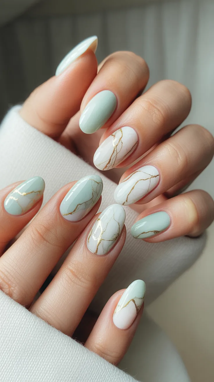 This manicure feels like wearable marble—elegant, slightly artistic, and undeniably chic. The mix of milky white and soft sage tones creates a calm, spa-like vibe, while those delicate Gold lines ripple across the nails like natural stone veins. It’s the kind of design that catches the light when you move your hands, making even simple gestures feel a little more glamorous.