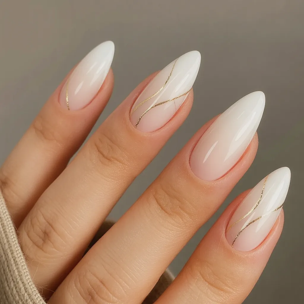 13. Milky Almond Nails with Delicate Gold Lines