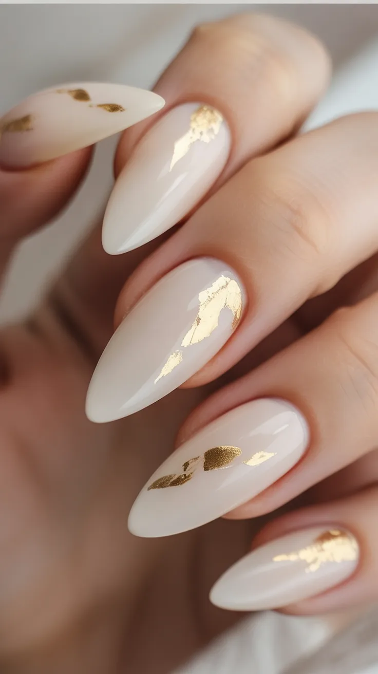 20. Milky White Almond Nails with Gold Foil Art
