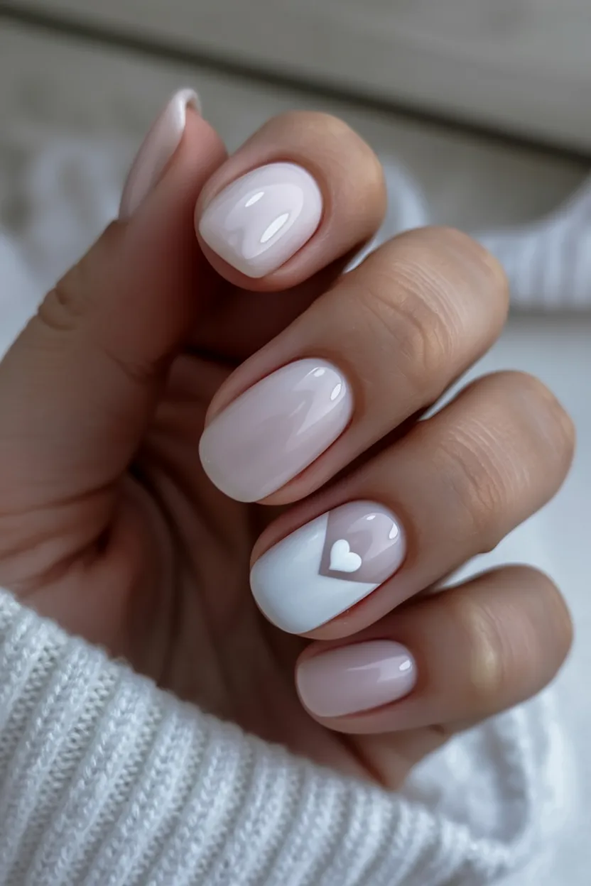 5. Minimal Milky White Short Nails with Tiny Heart Design