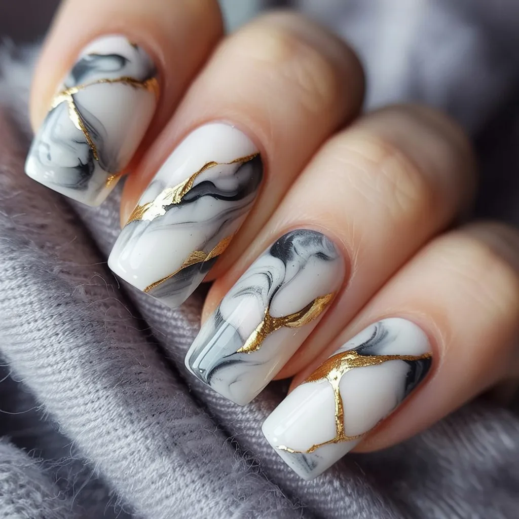 If you love nails that feel a little luxurious without screaming for attention, this marble-inspired look is pure magic. The milky white base creates a soft canvas while smoky gray swirls move across each nail like delicate clouds. Then come the subtle Gold veins — thin, elegant streaks that catch the light just enough to make the whole manicure feel special. It’s artistic without being busy, modern but still timeless.