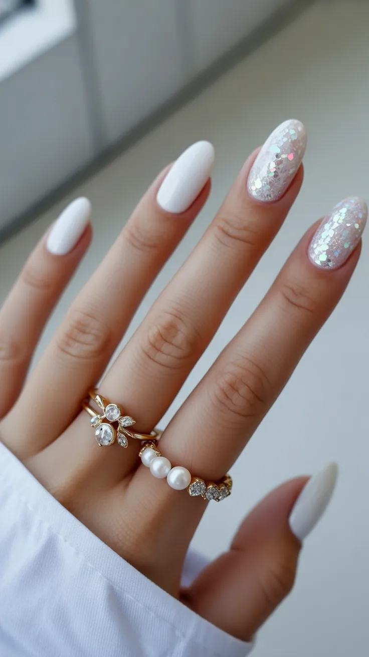8. Milky White Almond Nails with Glitter Accent