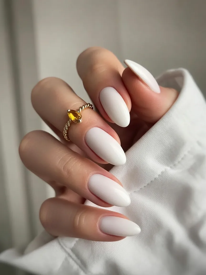 Clean, creamy, and effortlessly polished—this manicure proves that sometimes the most beautiful Ideas are the simplest ones. The milky white shade gives the nails a soft porcelain glow, while the almond shape adds a graceful elongation to the fingers. It’s the kind of manicure that pairs perfectly with cozy sweaters, delicate rings, and that quiet confidence that comes from knowing your style always looks put together.