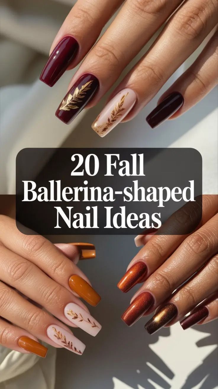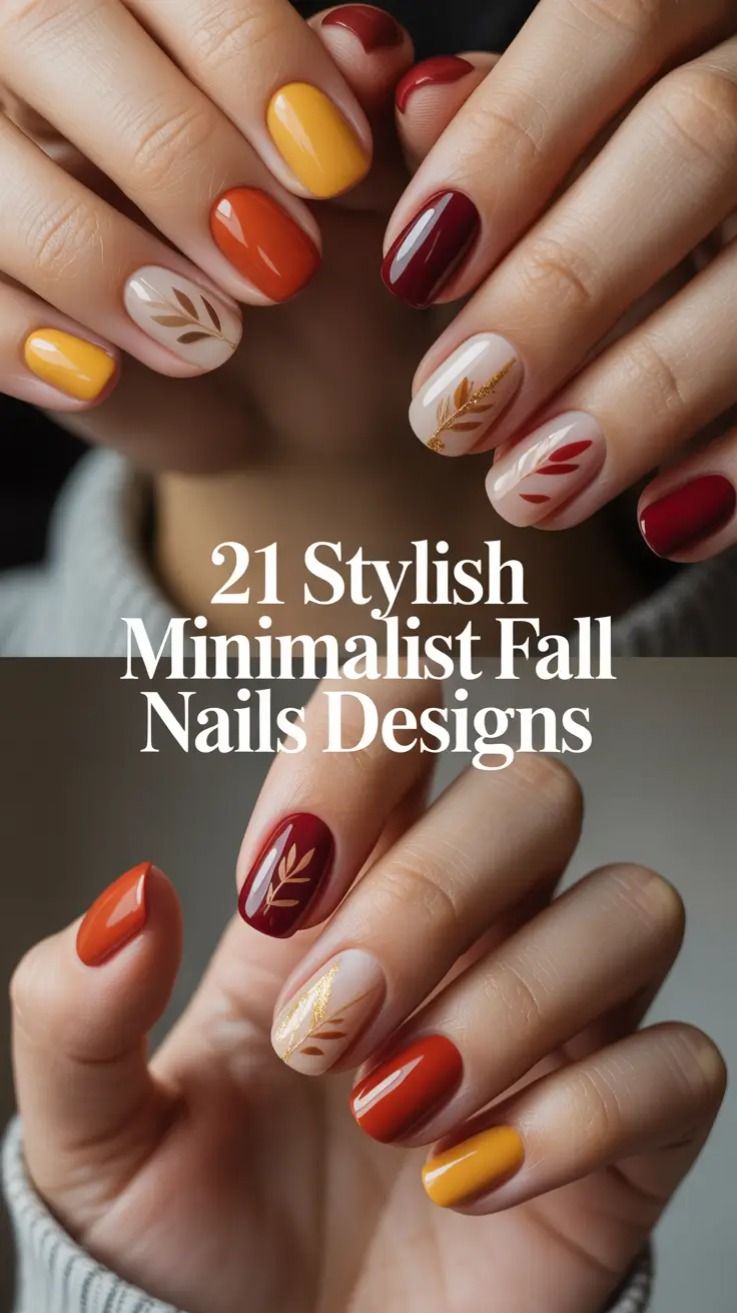 Short square nails mix matte olive, pumpkin orange, and nude with a delicate drawn leaf. It’s cozy, wearable, and full of fall vibes.