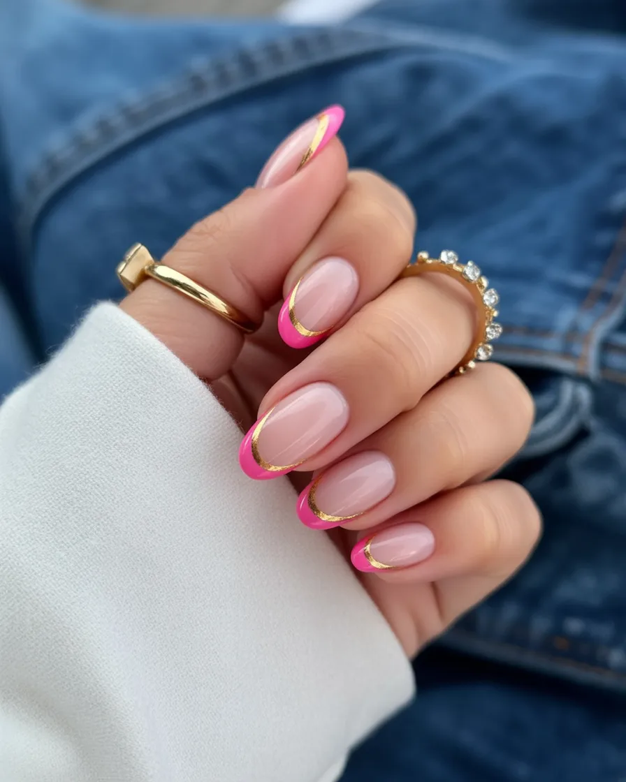 If you love a classic manicure but still want a little personality, this one feels like the perfect balance. The soft pink base keeps everything elegant and feminine, while the bold Hot pink tips bring just enough playful energy. The curved gold line separating the colors adds a subtle luxury touch, turning a familiar french tip into something that feels modern and fresh.