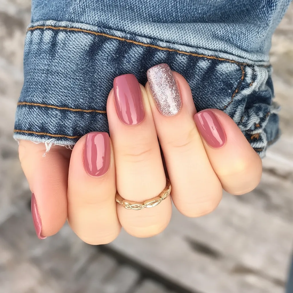 Sometimes the most beautiful manicures are the ones that keep things simple. These muted dusty pink nails have that quiet sophistication that works with absolutely everything. The glossy Dark rose tone feels warm and flattering on the skin, while the single Glitter accent nail adds just enough sparkle to catch the eye. It’s the perfect balance between subtle and stylish.