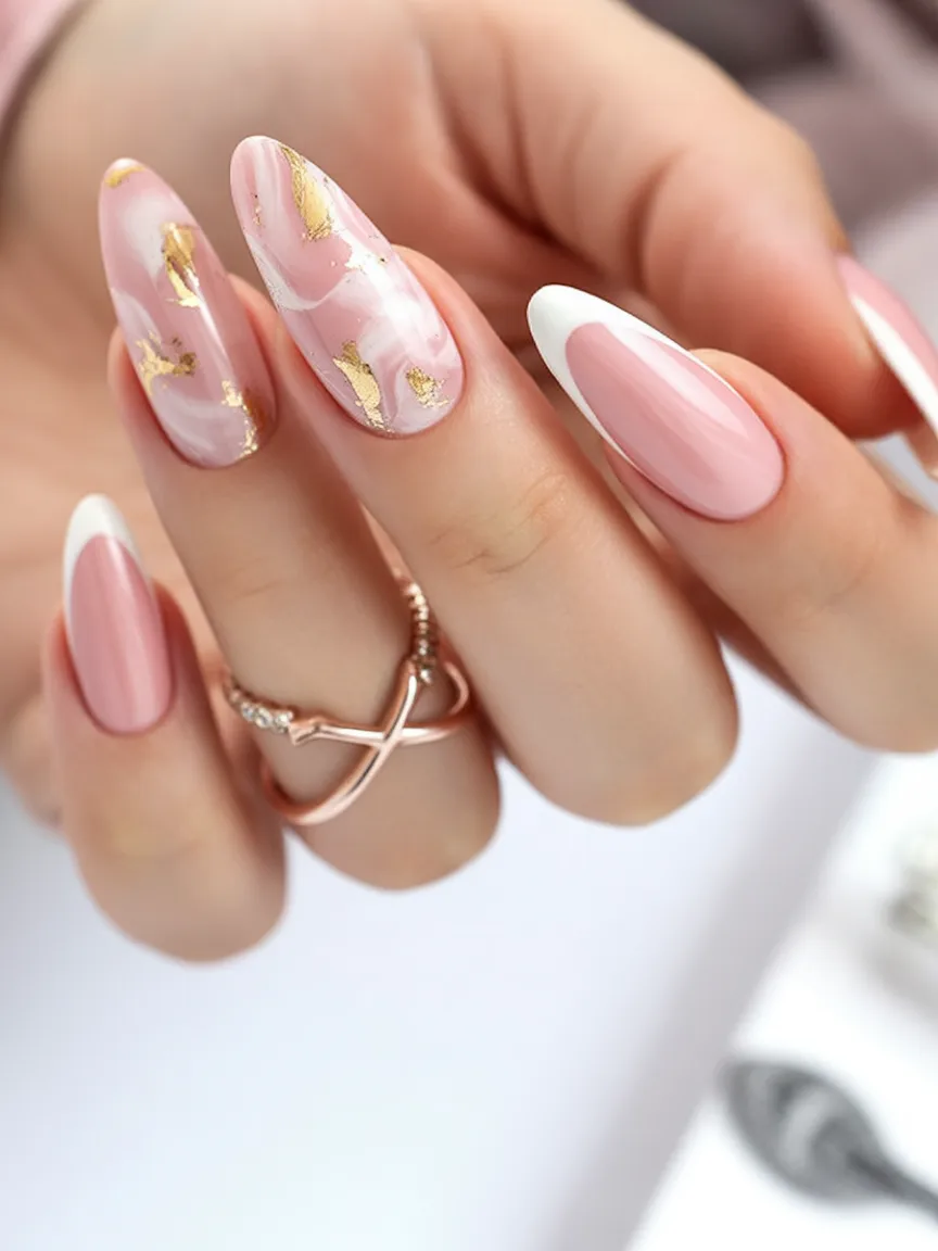 This manicure feels like the perfect blend of elegance and creativity. Soft pink nails sit alongside dreamy marble accents that swirl with White and delicate gold textures. The crisp white tips add a familiar french tip feel, but the overall look is far more artistic and modern. It’s a design that feels luxurious yet soft, like wearing your favorite silk blouse.