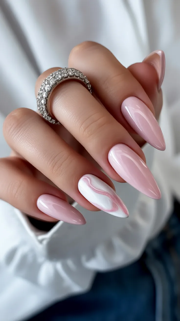 There’s something quietly elegant about this soft pink manicure. The glossy Light pink shade looks clean and graceful, while the single marble accent nail adds a gentle artistic twist. The swirl of White and pink feels almost like a delicate ribbon drifting across the nail. It’s feminine without being overly sweet and polished without feeling stiff—exactly the kind of manicure that makes your hands look instantly more refined.