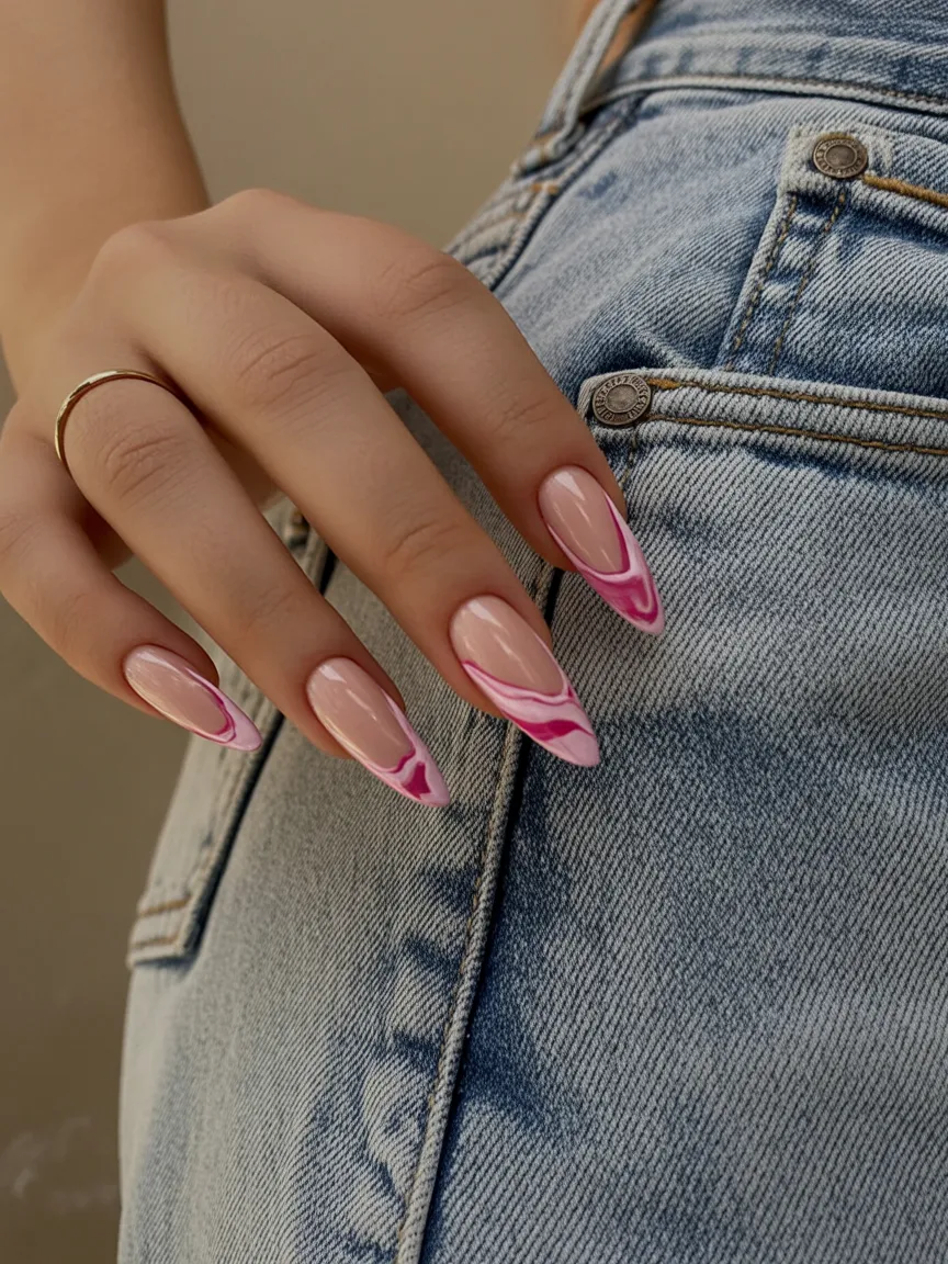 These nails have a playful, artistic energy that instantly feels fresh and modern. The soft nude base allows the flowing Hot pink swirl patterns to really shine, creating movement and personality across the Almond-shaped nails. The curves almost resemble liquid ribbons drifting across the surface, giving the manicure a creative, fashion-forward vibe.