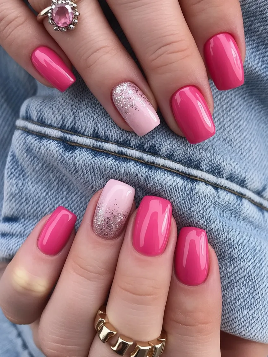 Sometimes a manicure just needs a burst of color to instantly lift your mood. These Bright Hot pink nails are bold, cheerful, and impossible to ignore. The glossy finish makes the color pop beautifully, while the single Glitter accent nail with a soft gradient sparkle adds a playful, festive detail that catches the light perfectly.