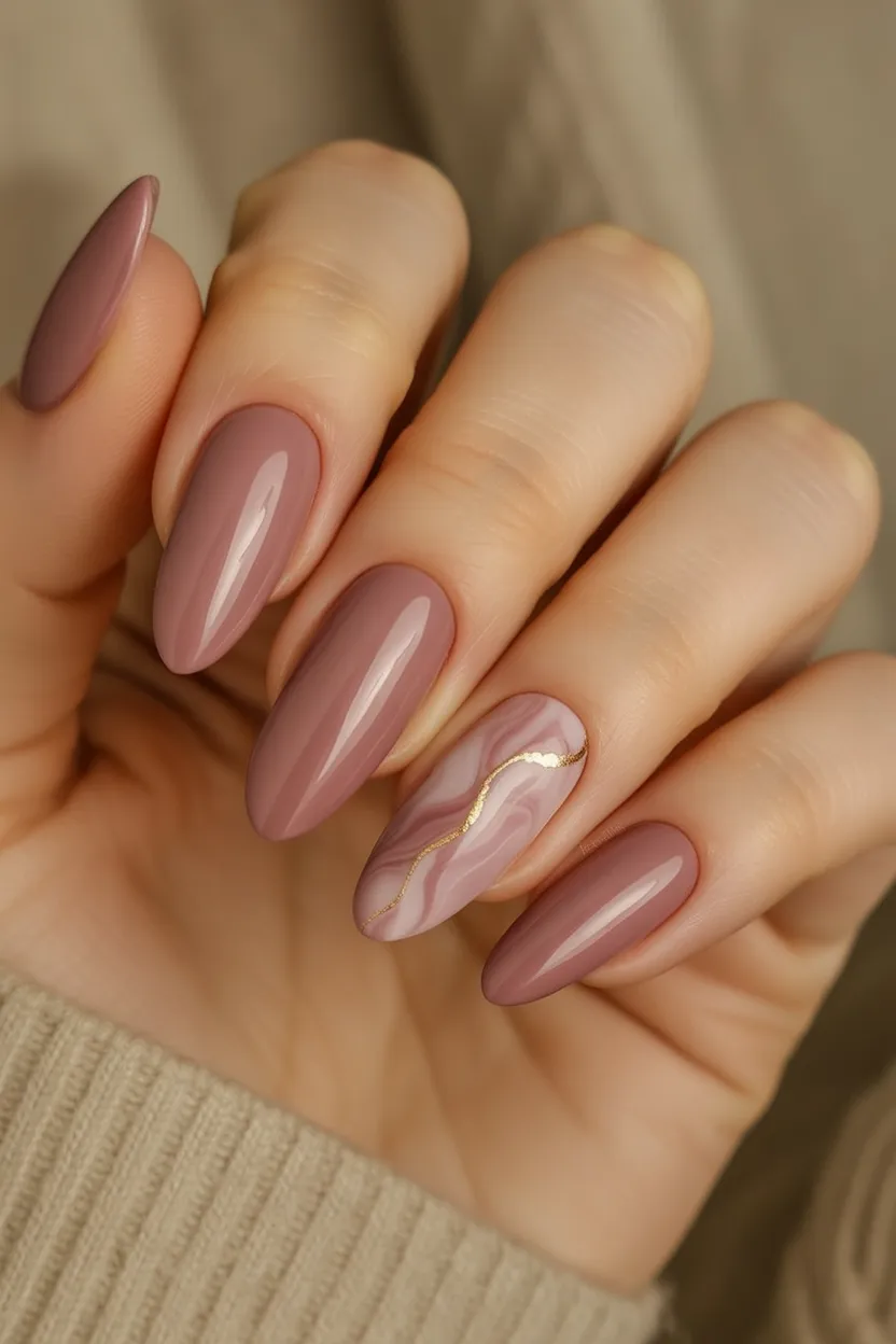 There’s a quiet sophistication in these mauve pink nails that feels incredibly chic. The creamy Dark blush shade looks rich and elegant, while the single marble accent nail with a thin gold line adds just enough intrigue. It’s the kind of manicure that feels understated yet undeniably stylish, perfect for women who appreciate refined details.