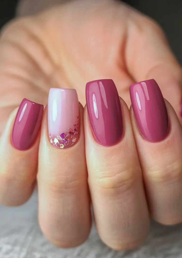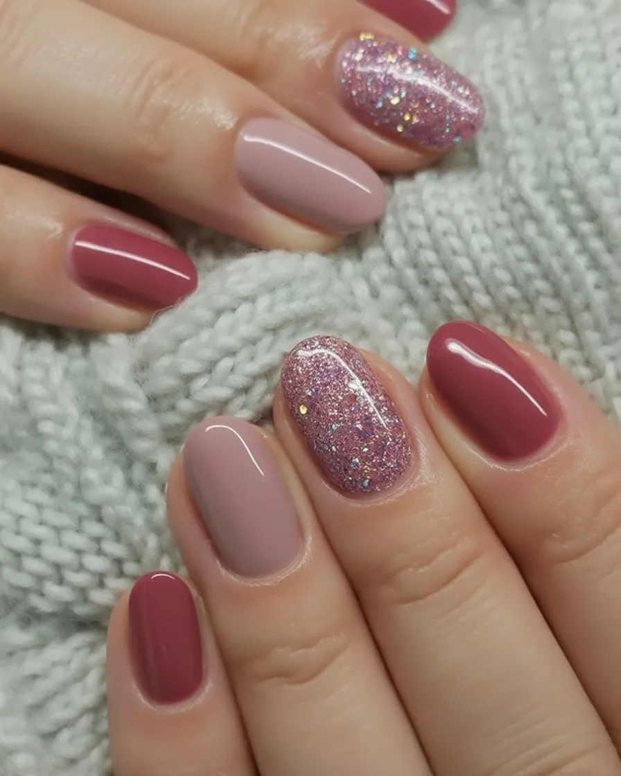 There’s a warm, cozy feeling to this muted pink manicure that makes it incredibly wearable. The creamy rose shade feels soft and feminine, while the subtle gradient accent nail with sparkling Glitter adds just enough interest to keep things playful. It’s the kind of manicure that looks equally perfect with a chunky sweater or a polished office outfit.