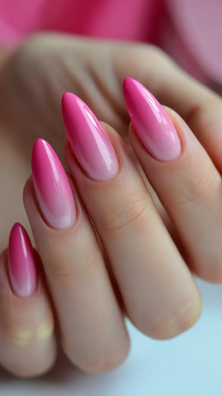 This manicure feels like summer captured on your fingertips. The soft transition from Light pink to Bright Hot pink creates a beautiful ombre effect that feels both fresh and feminine. A hint of fine shimmer within the gradient gives the nails a soft glow, making the color shift appear even more dimensional.