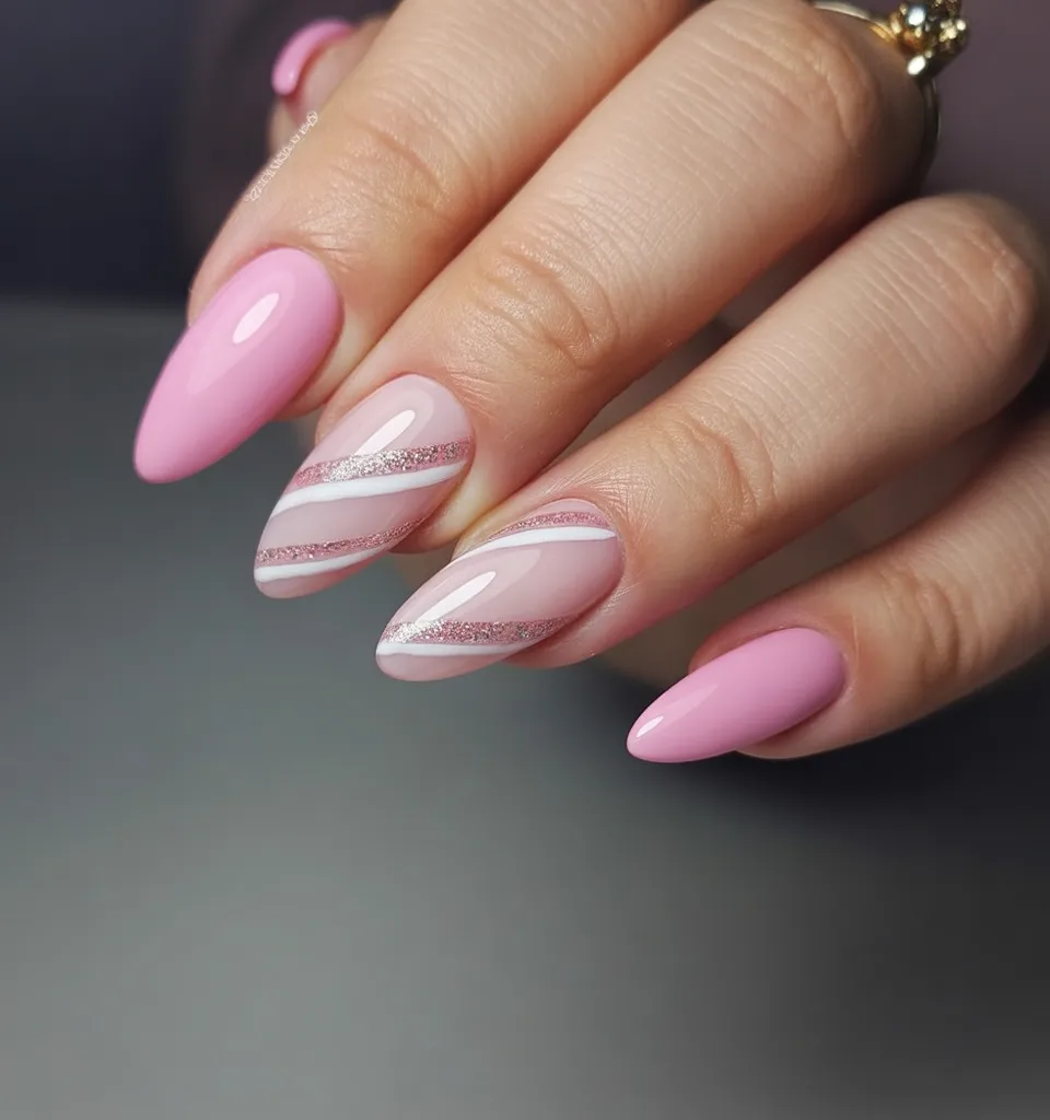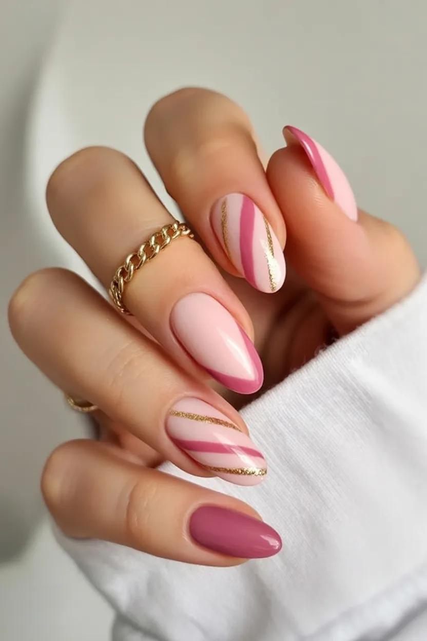 This manicure has a fun, slightly retro charm that instantly catches the eye. Soft pink nails are paired with delicate diagonal stripes in deeper pink tones, while thin gold lines glide between them like tiny ribbons. The result is a playful yet polished Design that feels creative without becoming overwhelming.