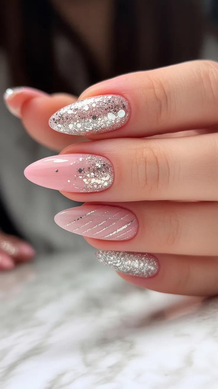 19. Soft Pink Almond Nails with Rose Glitter Waves