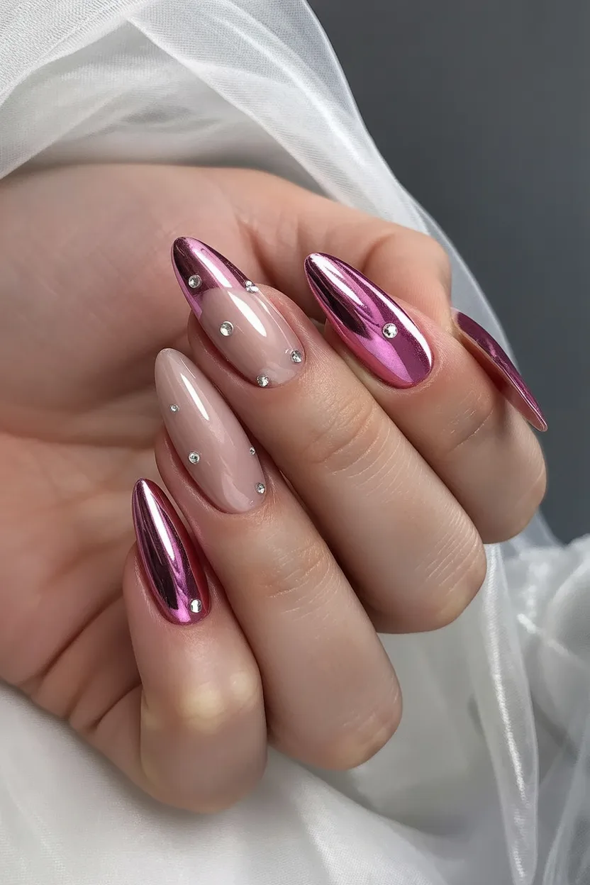 These nails are pure confidence. The reflective Hot pink chrome finish catches the light from every angle, creating a bold and modern look that instantly stands out. Combined with a few delicate rhinestone accents, the manicure feels glamorous but still sleek. It’s the kind of style that makes you want to gesture just a little more when you talk—because honestly, why not show them off?