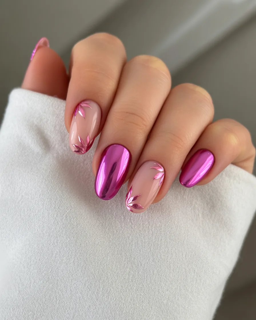 This manicure feels bold, artistic, and just a little bit glamorous. The reflective Hot pink chrome nails shine like liquid metal, instantly drawing attention, while the nude accent nails with delicate leaf patterns soften the look with a graceful botanical touch. It’s a striking combination that feels modern and expressive without being overwhelming.