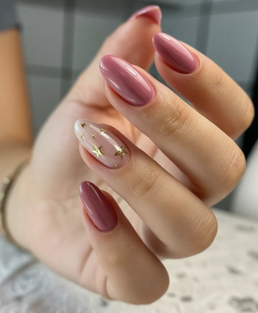 These soft mauve nails carry a calm, polished beauty that feels timeless. The creamy Dark pink shade looks rich and flattering on the skin, while the delicate accent nail sprinkled with tiny gold stars adds a hint of dreamy charm. It’s the kind of manicure that feels subtle at first glance but reveals lovely details the closer you look.