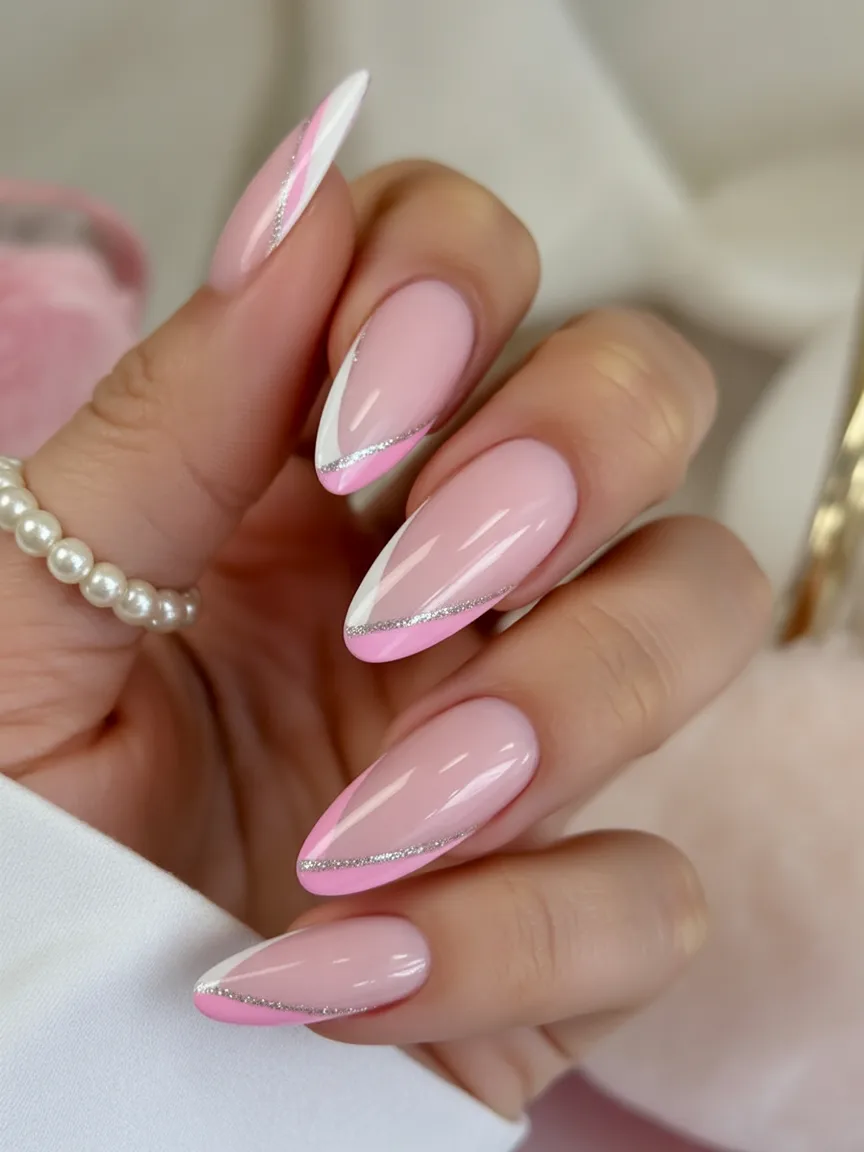 This manicure feels like a modern twist on a beloved classic. A glossy Light pink base keeps the look soft and feminine, while the diagonal White and pink french tip lines create a fresh, dynamic shape across the nails. A delicate silver shimmer line runs along the edge, giving the entire style a subtle sparkle that feels polished and sophisticated.