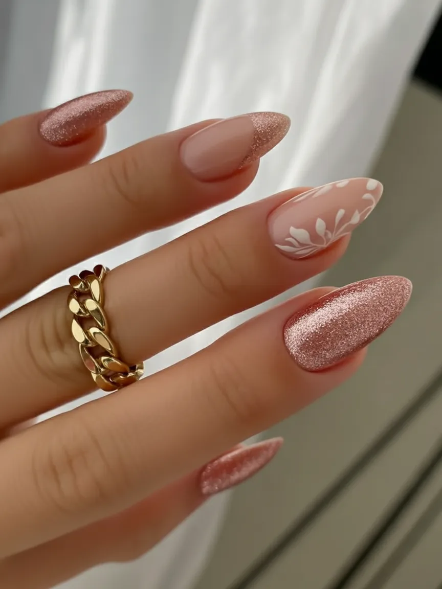 This manicure feels like jewelry for your fingertips. The shimmering rose gold Glitter nails bring a luxurious sparkle, while the soft nude pink accents add a gentle contrast that keeps the look sophisticated. One nail features a delicate White floral pattern that softens the overall effect and adds a romantic artistic touch.