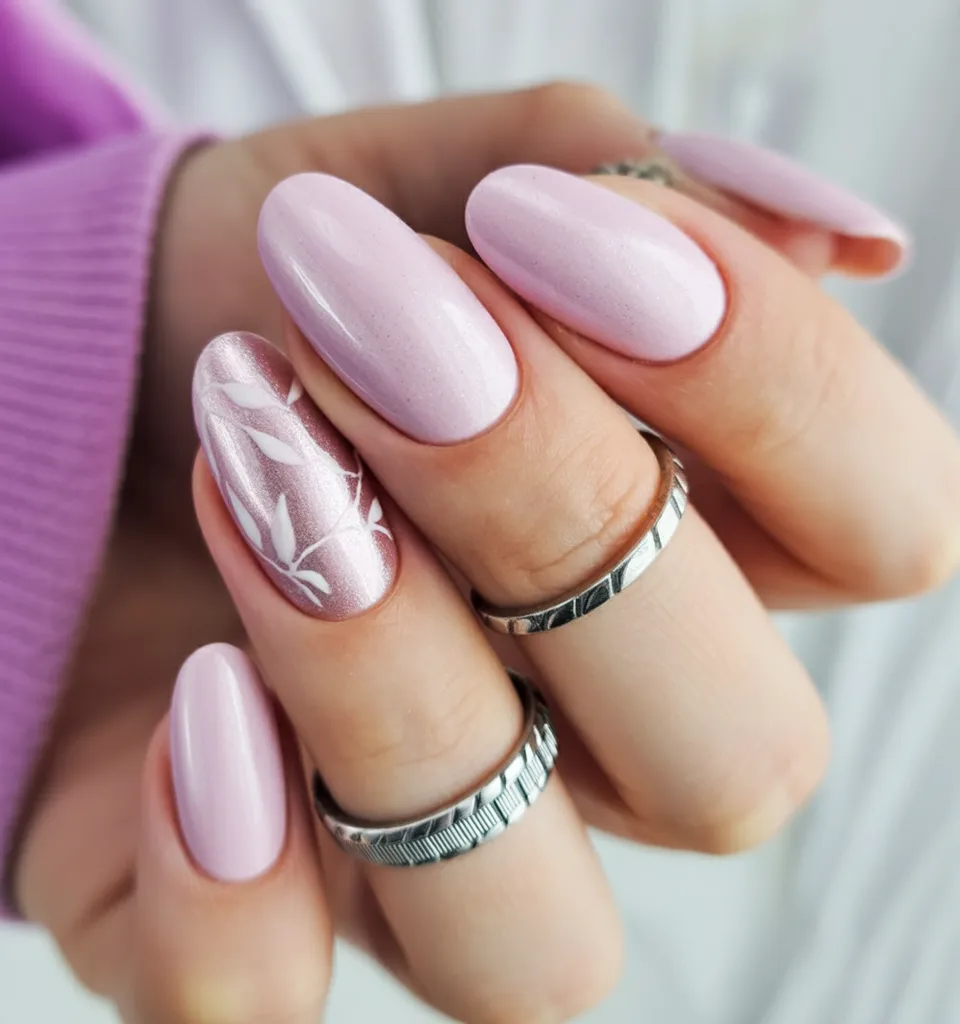 These nails have a dreamy, almost ethereal quality to them. The soft lavender-toned pink base creates a smooth, creamy finish that feels calm and delicate, while the metallic accent nail adds a reflective chrome texture decorated with gentle floral details. The result is a manicure that feels artistic, soft, and quietly luxurious.