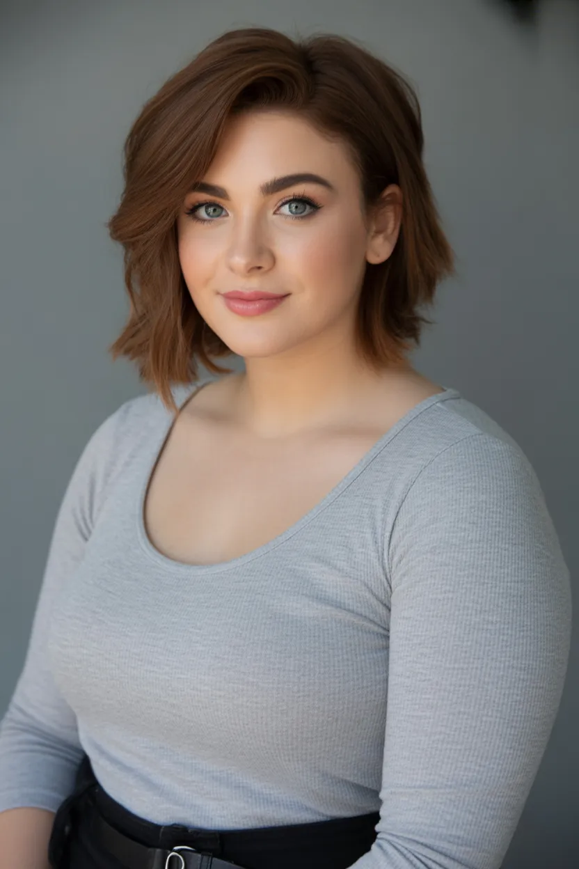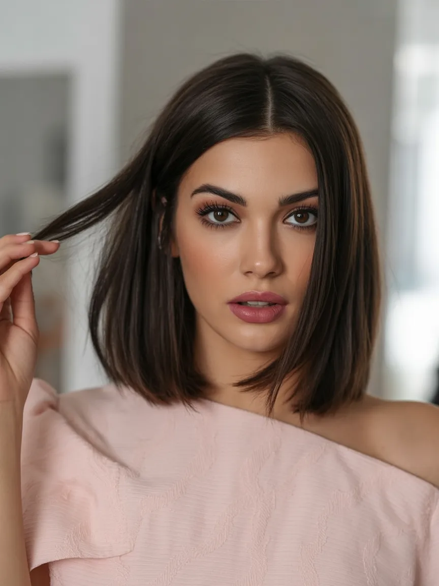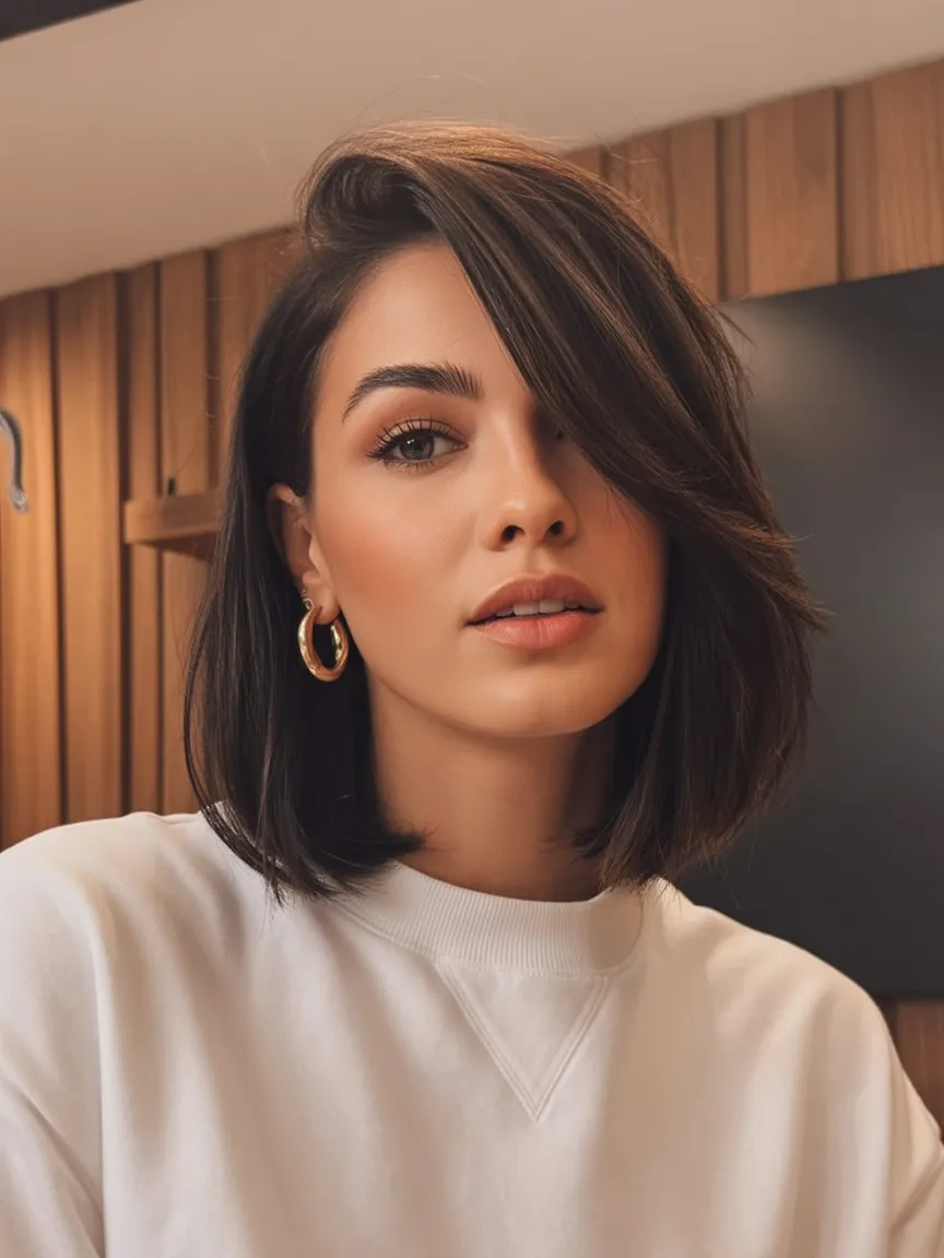 A sleek Short straight bob with a deep side part is pure understated elegance. The angled line gently frames the jaw while the asymmetry visually lengthens a round face. It’s chic, confident, and just a little bit bold without being dramatic.