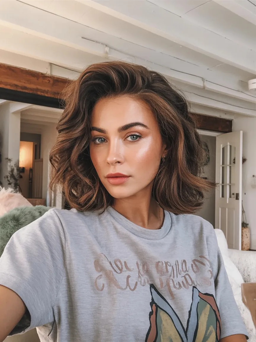This Short wavy hair look is pure confidence with a little sass on the side. The volume at the crown instantly lifts the face, while the soft waves break up fullness around the cheeks in the prettiest way. It feels playful but polished, like you finally decided you’re done hiding behind your hair and ready to show off those cheekbones.