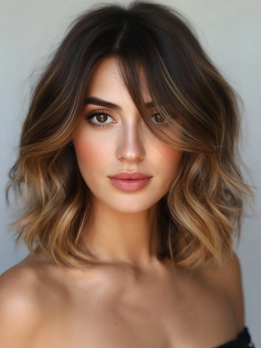 This textured Medium length cut with soft side Bangs has that flirty, effortless energy that instantly softens a round face. The movement through the ends keeps everything light, while the sweeping fringe adds a little mystery. It’s playful but grown-up—like you’ve mastered relaxed glamour.